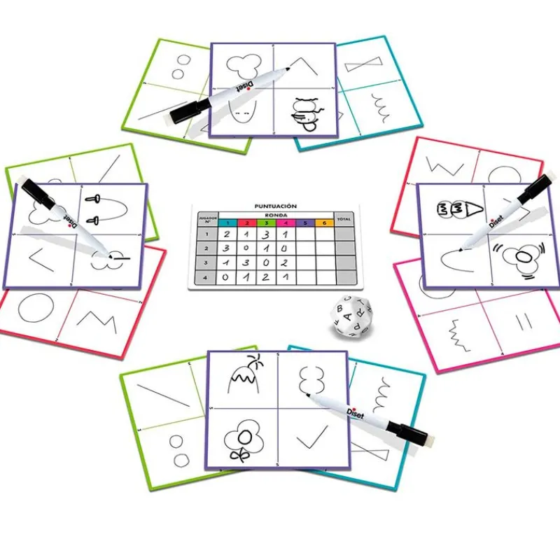 Party & Co Trazos es un divertido juego inspirado en una de las pruebas del conocido juego de mesa Party & Co ¡No es necesario saber dibujar para ganar! El ingenio y la imaginación es la clave para ganar. Todos los jugadores cogerán el mismo tablero con unos garabatos predeterminados, se tira el dado de letras y todos los jugadores tendrán que dibujar sobre el tablero 4 cosas que empiecen por la letra que haya salido utilizando los garabatos predeterminados ¡Ganará el juego quien demuestre tener más ingenio e imaginación! En el interior encontrarás 12 tableros reversibles con garabatos, un dado de letras, 4 rotuladores borrables y una pizarra de puntuación. Recomendado a partir de 8 años.