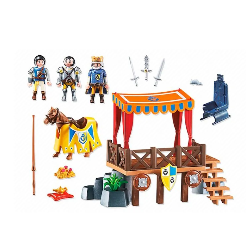 Tribuna Real con Alex, el Rey Kenric y Sir Gareth com un caballo preparado para el torneo, equipamiento, trono real y a Alex con una lanza. En el escondite secreto hay espacio para la valiosa «tetera de oro» y otros grandes tesoros.
