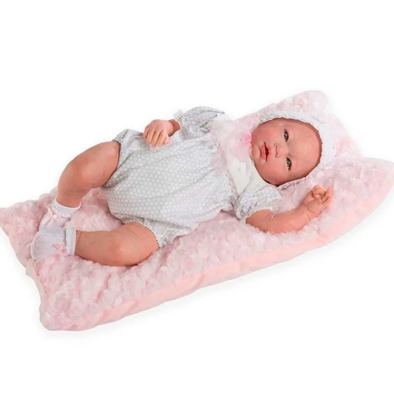 La zona del tronco es de algodón para poder vestir y desvestir con facilidad y colocarla en posturas y posiciones de un bebé real. Sus articulaciones (cabeza y extremidades) son de movimiento limitado. No tiene pelo, incluye un bonito cojín en el que recostarla.