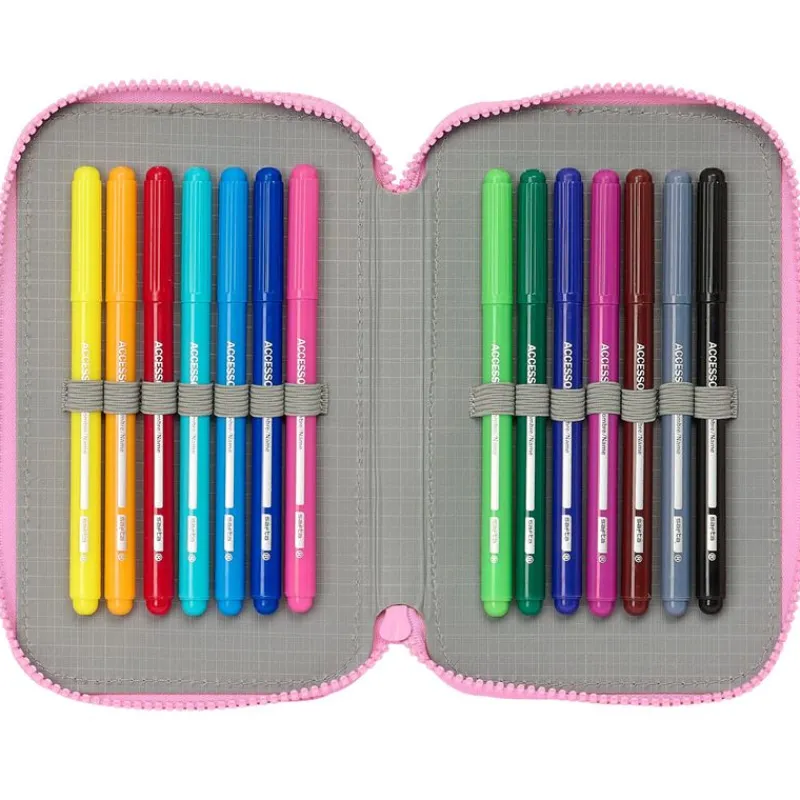 Estuche doble con diseños inspirados en la serie de animación la Casa de Muñecas de Gabby. En el interior encontrarás goma, sacapuntas, lápiz, bolígrafo, lápices de colores y rotuladores. Sus dimensiones son de 19.5 cm x 12.5 cm x 4 cm aproximadamente.