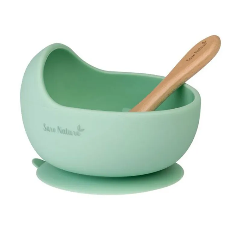 Set de alimentación compuesto por cuenco con ventosa en la parte inferior para evitar derrames, incluye cuchara a juego con mango de madera. Tiene un diseño práctico y original, gracias a su pared prolongada en forma de ola, para que el niño aprenda a comer solo. Empuja la comida contra la pared, hasta llenar la cuchara. Fomentando la independencia y autoestima de los más pequeños.