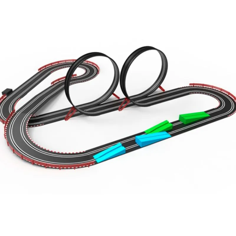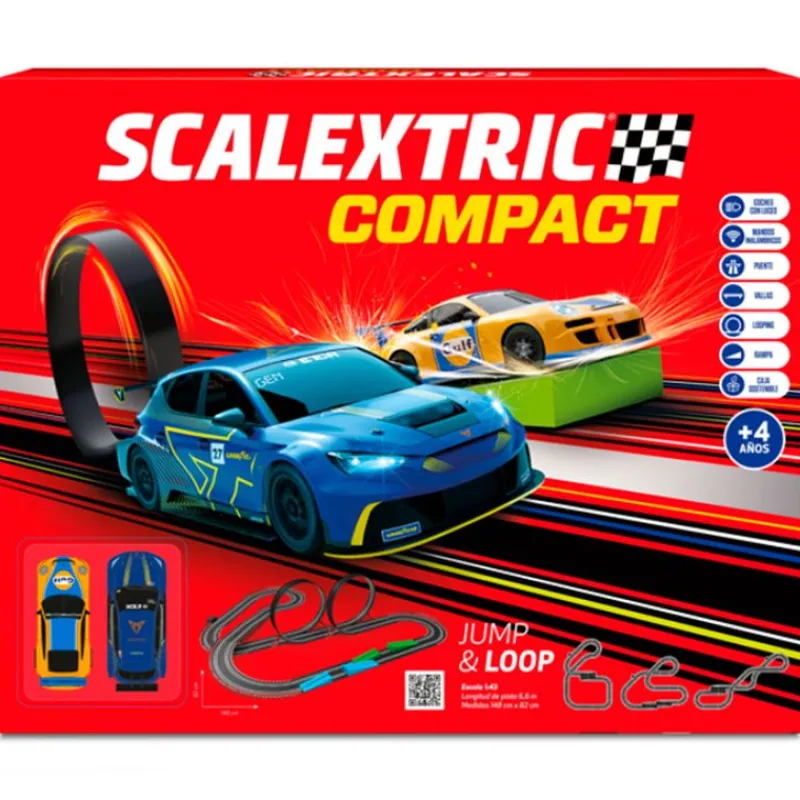 Jump & Loop es un vehículo de la colección Scalextric Compact con una pista de 6.6 metros. Sus mandos son Wireles, específicos para las manos de los más pequeños de la casa y con turbo, para experimentas una aceleración espectacular. En el interior encontrarás dos coches, un Audi S1 RX y un Hyundai I-20 RX. Dispone de un expectacular looping de doble rizo, un puente y vallas incluidas. Recomendado a partir de 4 años.