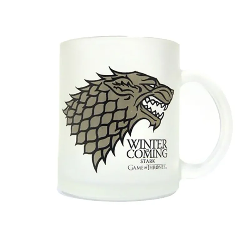 Taza de cristal translucido con el emblema de la casa Stark de la prestigiona serie Game Of Thrones.