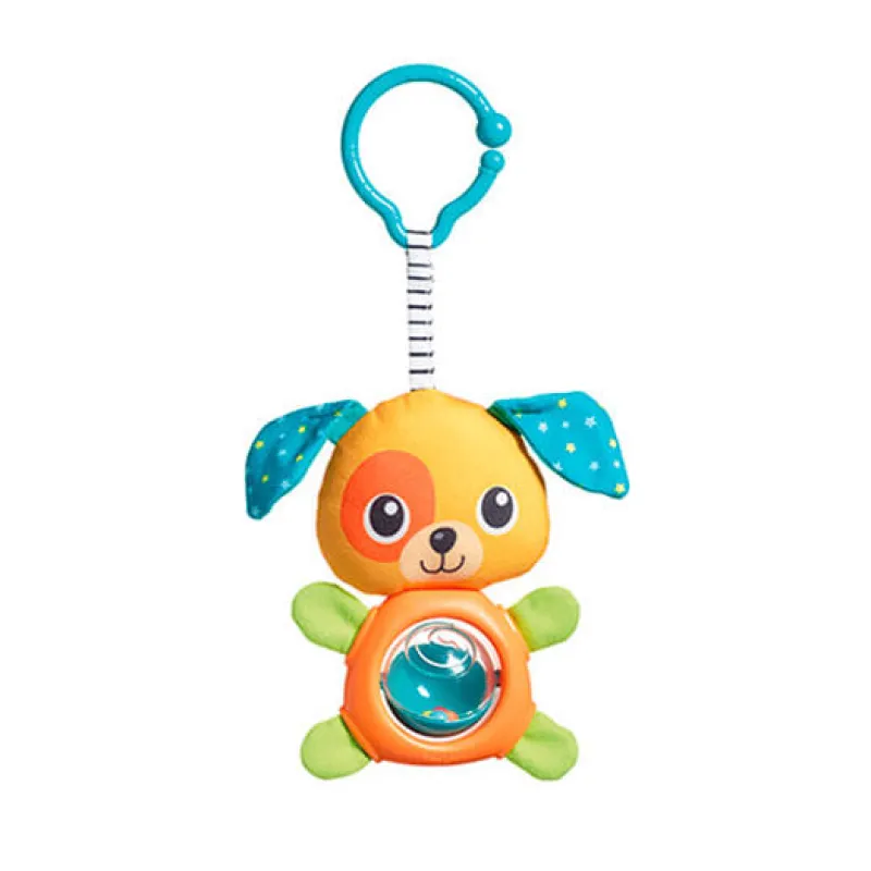 Sonajero en forma de perrito. Es de tela y la barriga del perrito es una pelota que gira con bolitas de differentes colores. Ayudará a estimular el sentido del tacto del bebé.