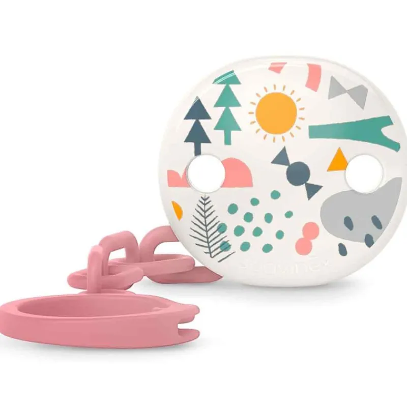 La pinza- clip de la cadena lleva una arandela para que se pueda introducir el chupete y sujetarlo.