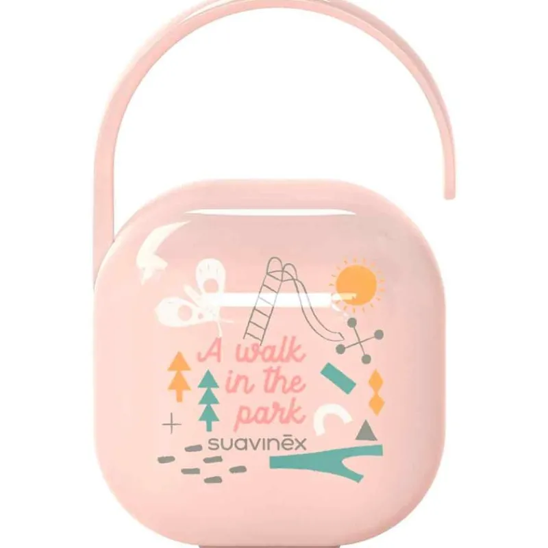 Cajita para guardar los chupetes y evitar que caigan al suelo, se ensucien o se pierdan, gracias a su asa flexible podrás colgarla en el carrito, el bolso o bien en la cuna.