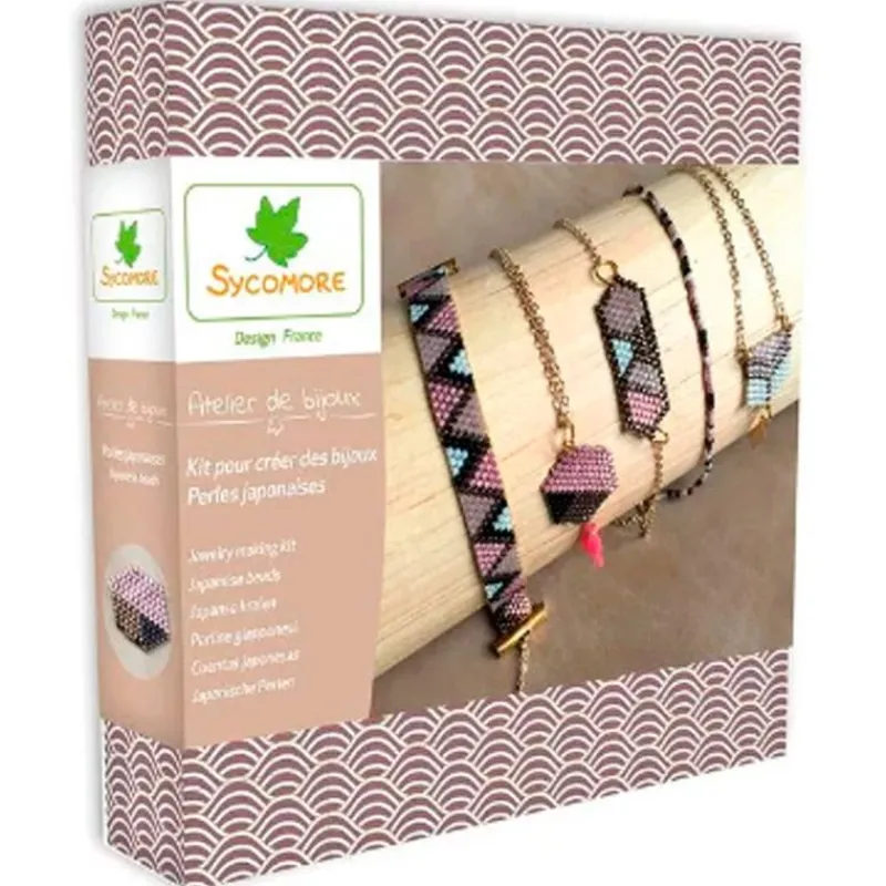 En su interior encontrarás 5 cajas de abalorios japoneses, 20 anillos, hilo de nailon dorado, 2 cierres específicos para abalorios japoneses, una cadena de 150 cm, un charm, un pompón rosa, una aguja muy fina, unos alicates e instrucciones
