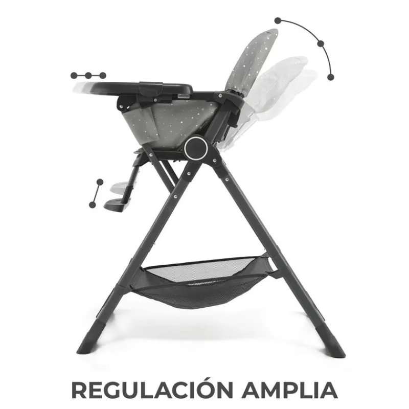 Tiene el respaldo reclinable en 3 posiciones, con una bandeja regulable a 3 niveles, que se puede lavar en el fregadero.