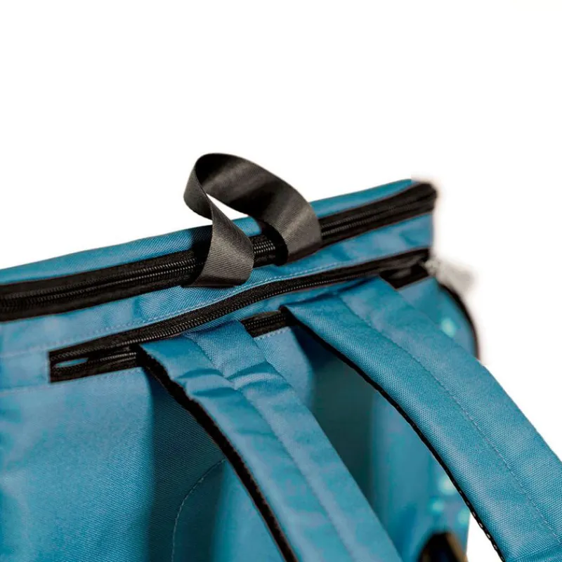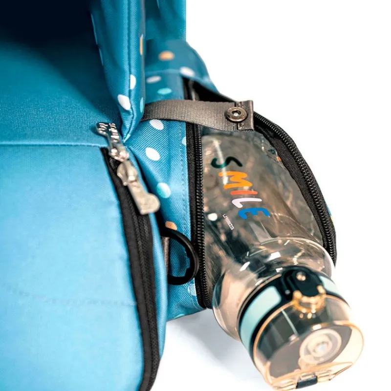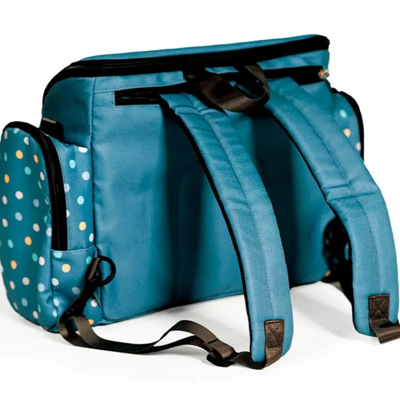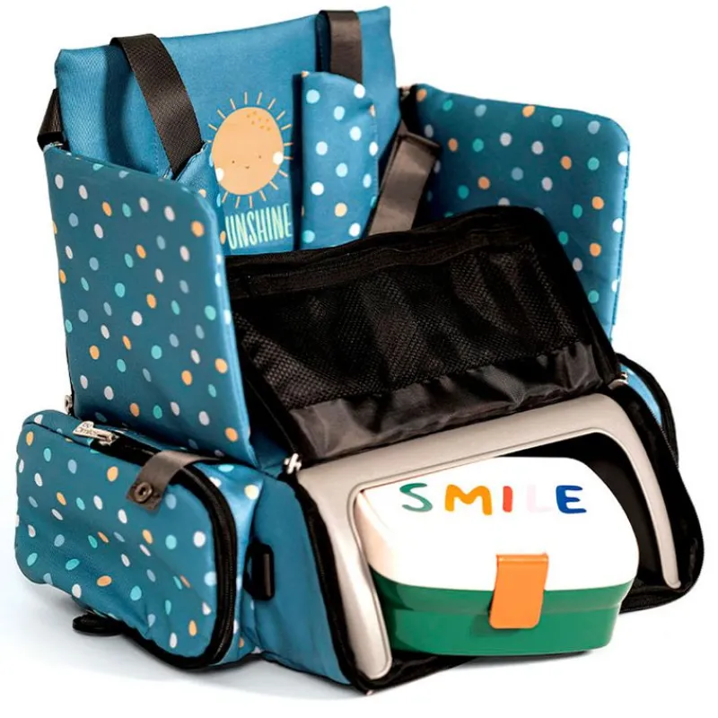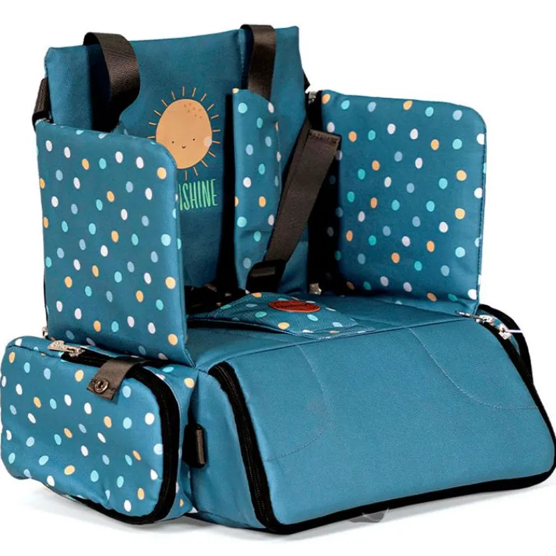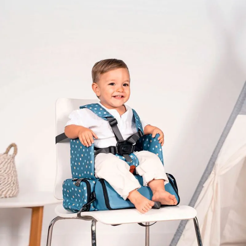 Trona elevador con estructura interior rígida que hace la función de trona portátil y bolso. Es la trona perfecta para ir a todas partes ya que se puede llevar como mochila o bandolera.