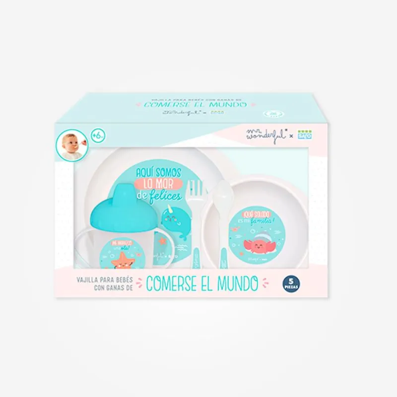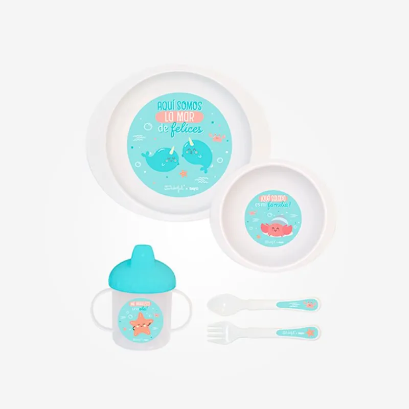 Esta vajilla está formada por un plato plano, bol, taza anti goteo, cuchara y tenedor