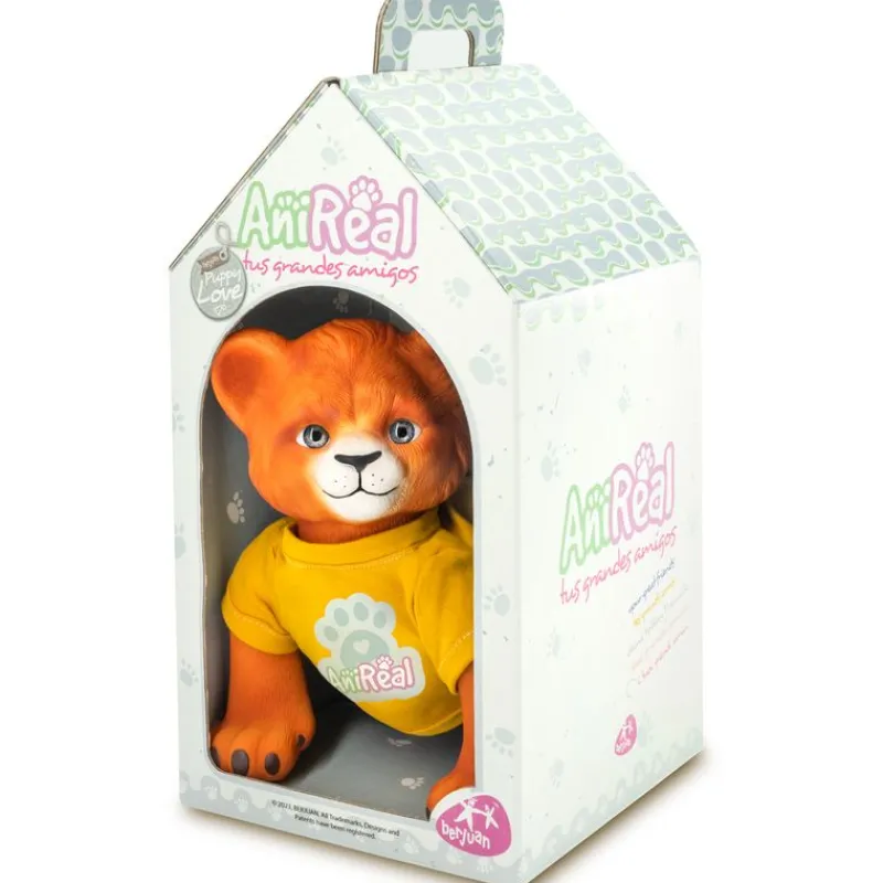 Mascota con cabeza y extremidades de vinilo y cuerpo blandito. La mascota simula una réplica de un cachorro real. Viene vestido con un pañal y una camiseta con la imagen de la marca. Tiene peso real de un cachorro, 950 gramos aproximadamente, mide 35 cm, tiene ojos de cristal y su decoración es artesanal.