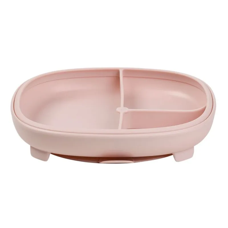 Plato antideslizante con base y compartimentos ergonómicos de silicona suave e irrompible para que aprender a comer sea más fácil y cómodo.