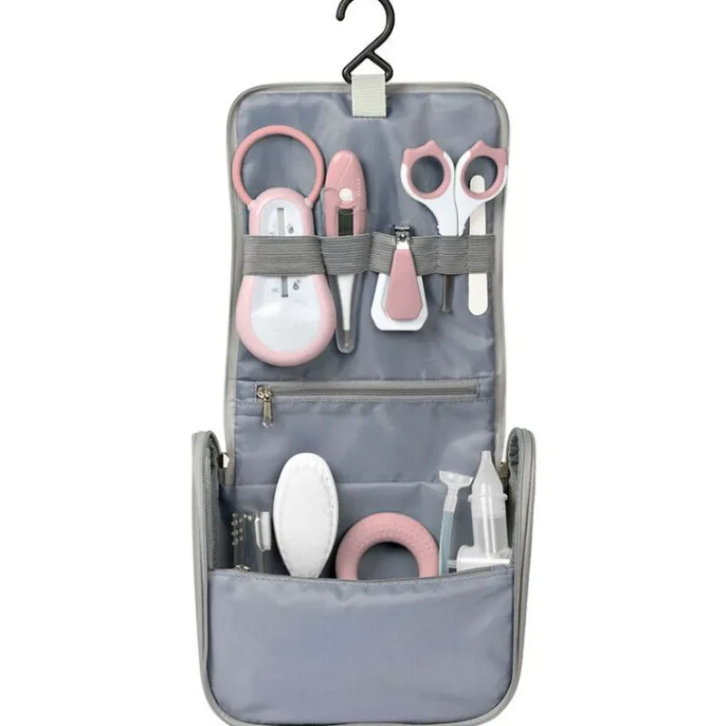 Nueve accesorios indispensables para el aseo y cuidados del bebé : termómetro de baño, termómetro digital, tijeras, corta-uñas, cepillo para el pelo, mordedor, aliviador encías, aspirador nasal manual, lima de uñas.