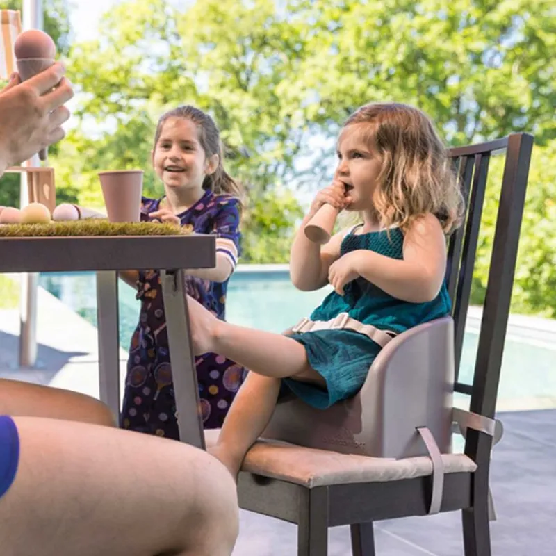 Incluye dos correas de fijación que se adaptan a la gran mayoría de sillas y un arnés de 3 puntos para cuando él bebe es pequeño