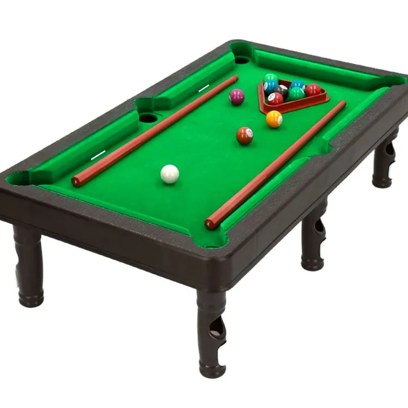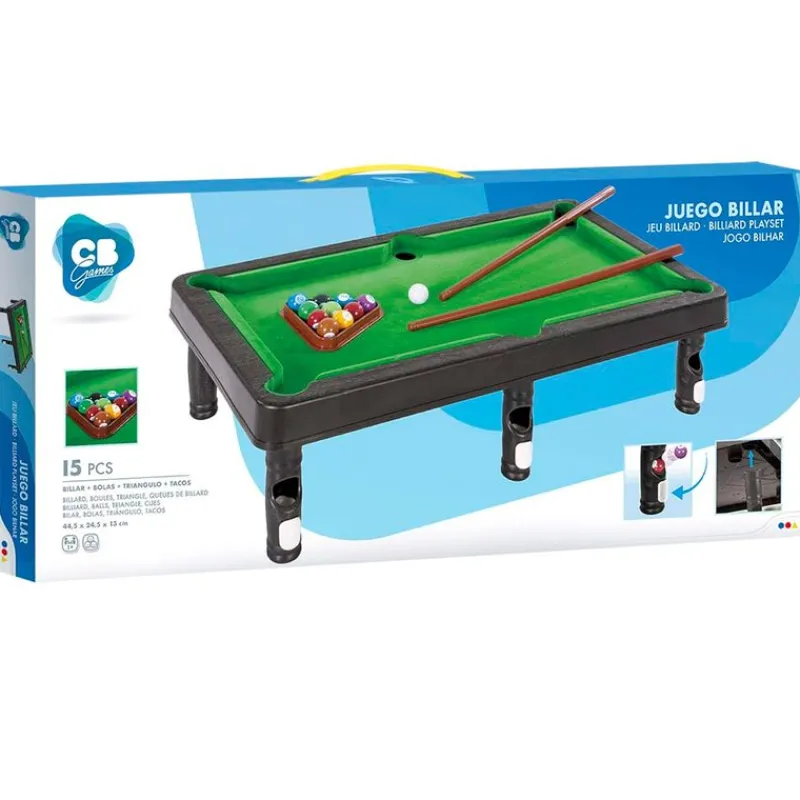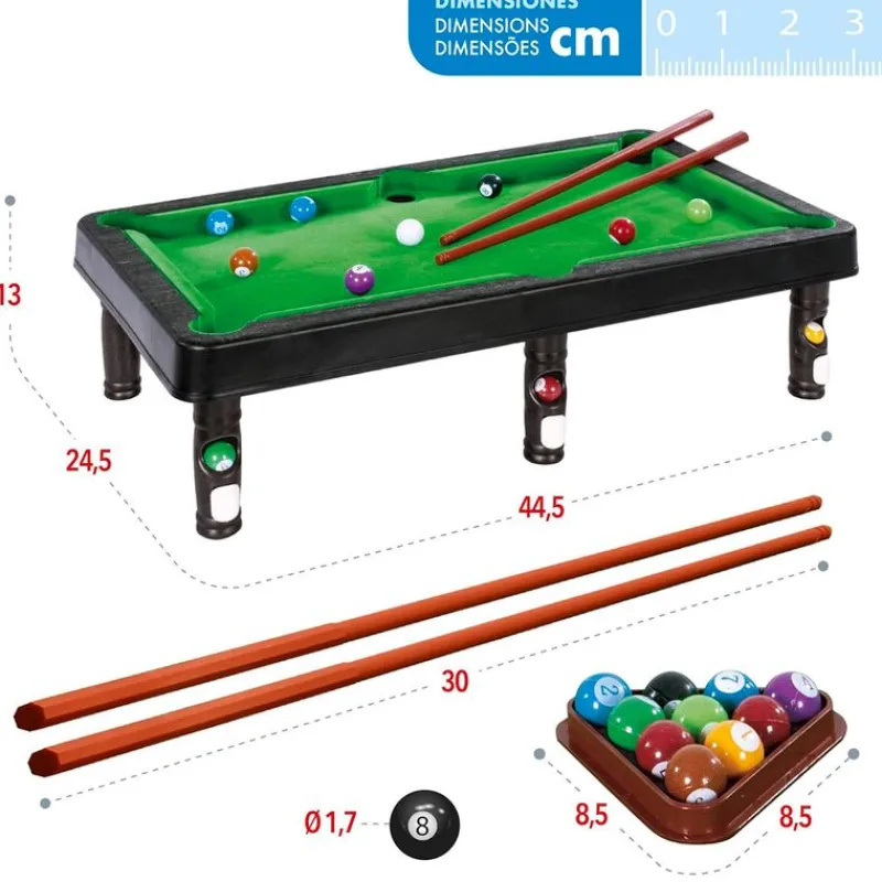 Billar de sobremesa con unas dimensiones de 44 cm x 24.3 cm x 12.7 cm aproximadamente. Ideal para que los más pequeños de la casa puedan maniobrar y resistente para que los adultos puedan disfrutar. Contiene un triángulo, 2 palos de 29.5 cm, 10 bolas de colores y una bola blanca. Recomendado a partir de 3 años.