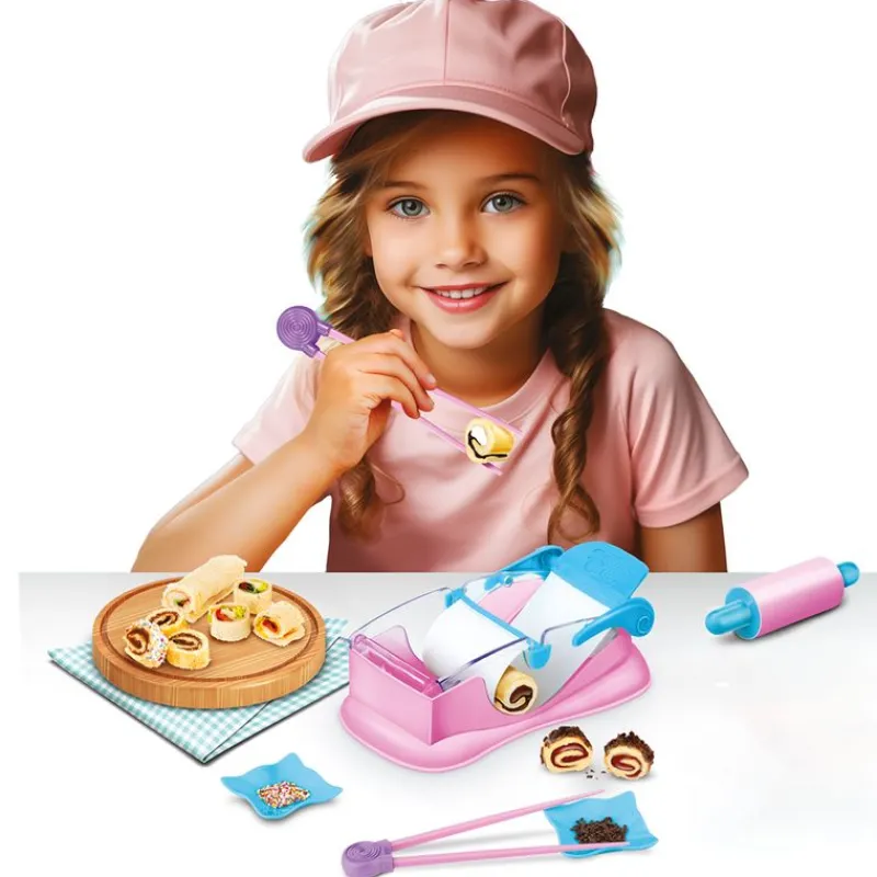 En el interior encontrarás la máquina de rollos, un rodillo, un tazón pequeño, 2 juegos de palillos y 2 platos para cubrir.