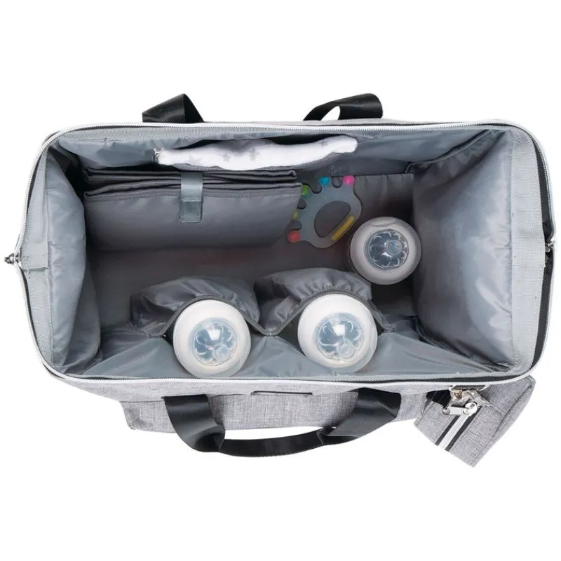 Es muy espaciosa, tiene capacidad para llevar los pañales y la ropa de muda del bebe, con 2 compartimentos para los biberones, el agua o la leche y un bolsillo externo grande.