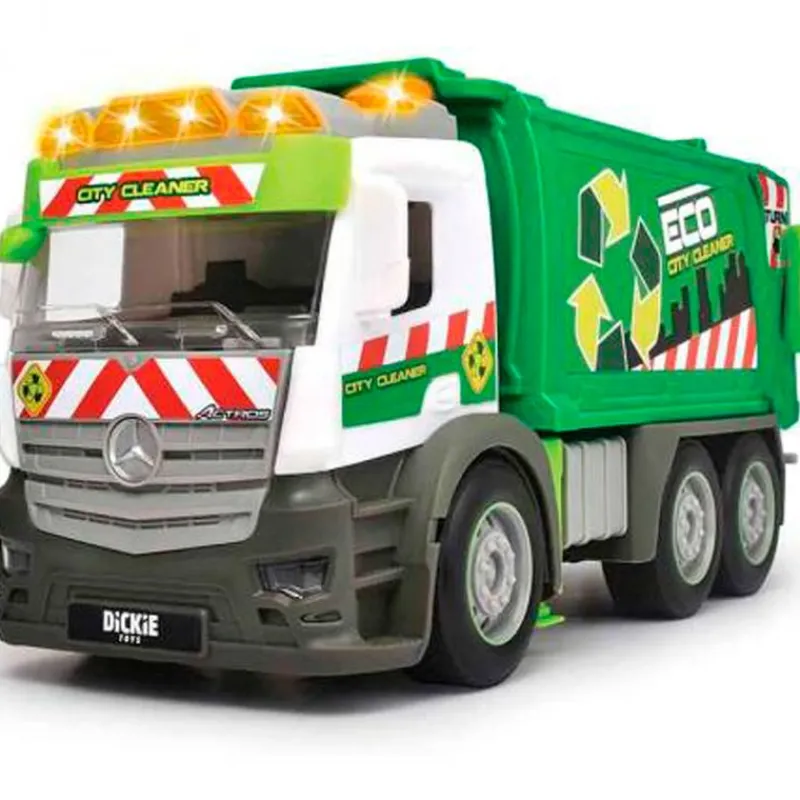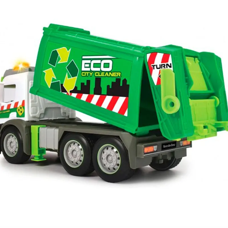 Camión de basura de la colección Mercedes con reproducción de luz y sonido. Funciona gracias a su mecanismo de fricción. Dispone de partes que podrás mover como si fuera un camión de basura de verdad. Incluye contenedor de basura. Tiene un tamaño de 26 cm aproximadamente. Recomendado a partir de 3 años.