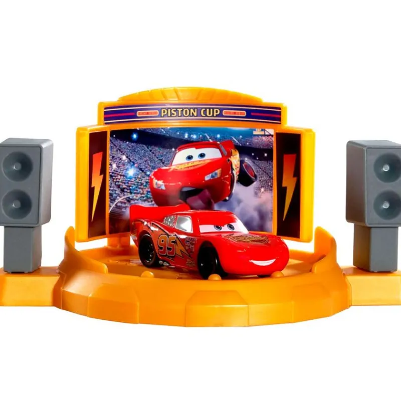 Pon a Rayo McQueen en el lanzador y lánzalo a toda velocidad por la pista y a través de las banderas a cuadros, haciéndolas girar ¡Echa un vistazo en la pantalla grande!