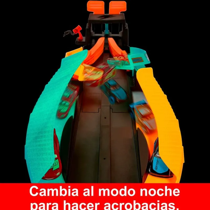 Pista de la colección Cars Glow Lanza y Cruza. Elige una de las 2 configuraciones y lanza a toda velocidad a Rayo McQueen y Jackson Storm. La pista de carreras en línea recta permite lanzar a los coches en paralelo para ver quién es el más rápido ¡El ganador se lleva la bandera y el segundo se queda parado en su pista! Cambia la configuración para crear un circuito nuevo con los carriles cruzados. El modo noche brilla en la oscuridad ¡Y los coches también! Recomendado a partir de 4 años.