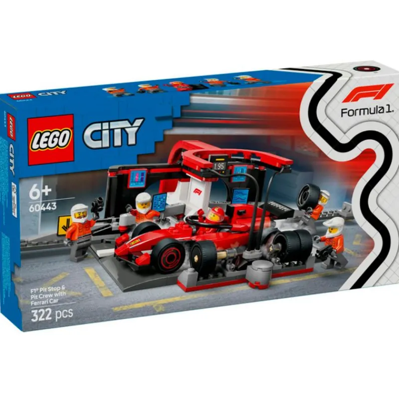 Pack de la colección LEGO City, compuesto de 322 piezas, con las que podrás construir la parada en boxes de F1 y equipo de mecánicos con coche Ferrari.