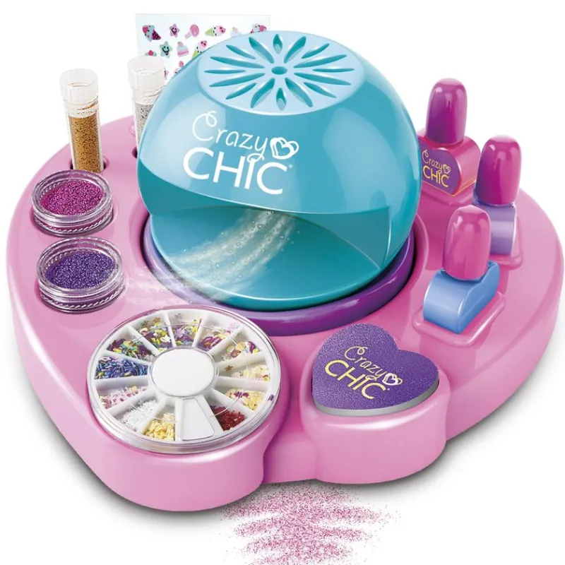 Cool Nail Art de la colección Crazy Chic, un estudio con el que podrás hacer tus propios diseños de uñas. En el interior encontrarás todo lo necesario para comenzar. Contiene una superficie de trabajo, esmalte de uñas brillante, una maquina secadora de esmalte, una lima, decoraciones adhesivas, decoraciones en forma de corazón, perlitas, decoraciones brillantes, purpurina de colores, pies anti-adherentes y el manual de instrucciones. Recomendado a partir de 6 años.