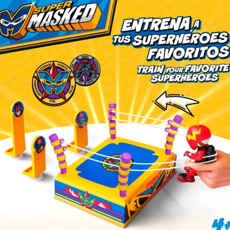 Playset de la colección Super Masked con el que podrás entrenar a tus luchadores favoritos. El ring de entrenamiento tiene unas dimensiones de 33.5 cm x 21.5 cm x 18 cm aproximadamente. Prepara los postes enfrente de la parte del ring que no tiene cuerdas, estira a tu Super Masked y lánzalo para tumbarlos y aplastarlos. Contiene un Super Masked exclusivo Kohetekin de 16 cm que reproduce sonidos (funciona con batería NO recargable). Recomendado a partir de 4 años.
