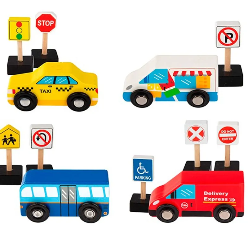 Pack de la colección Woomax en el que encontrarás 4 vehículos de madera y 8 señales de tráfico.