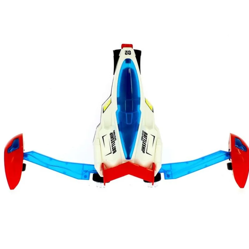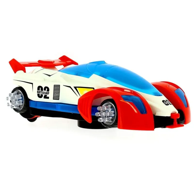 Vehículo de combate infantil que reproduce sonidos y dispone de luces giratorias. Se transformará automáticamente en una nave de combate al pulsar el botón que se encuentra en su parte frontal, extendiendo unas alas. Es un coche omnidireccional, cambiará de dirección al chocar contra algún obstáculo. Funciona con 3 pilas AAA NO incluidas. Recomendado a partir de 4 años.