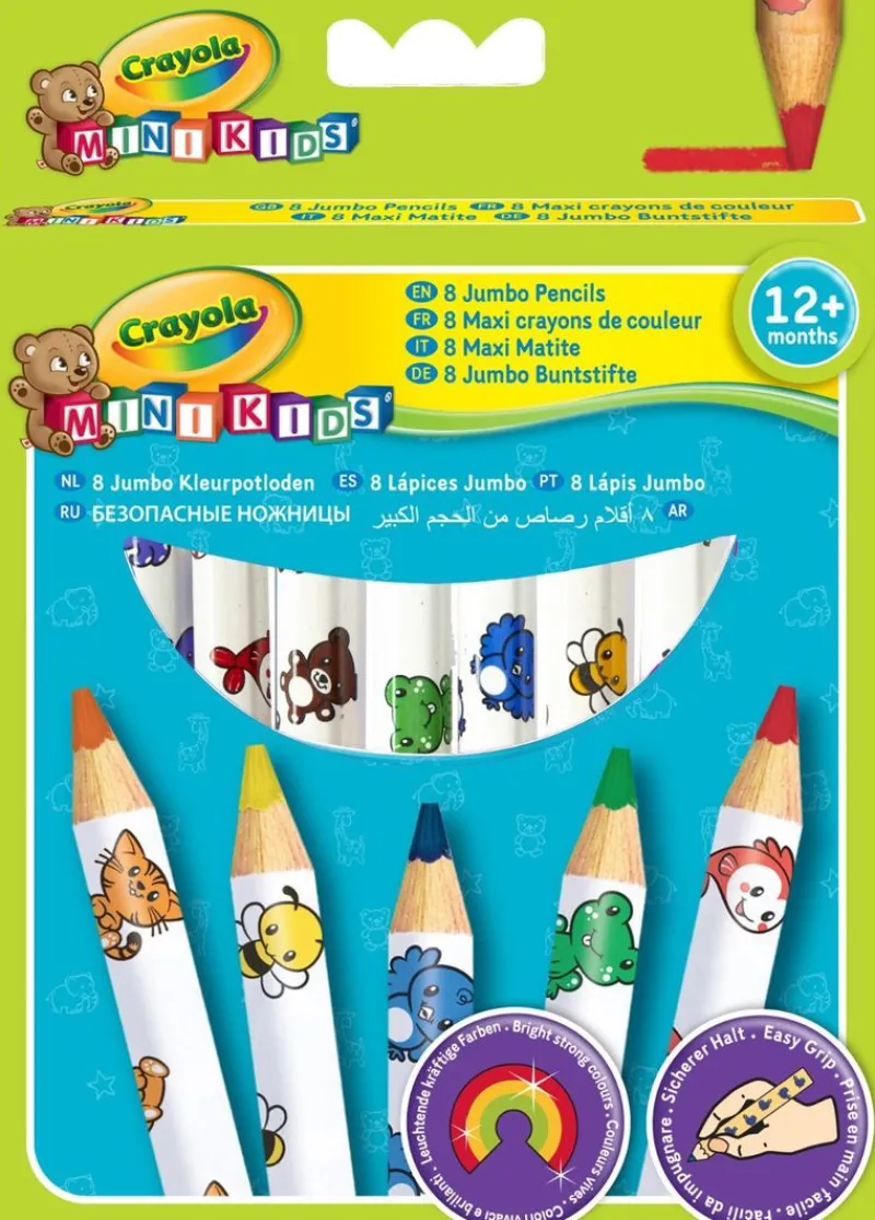 Set de 8 lapices de colores Jumbo. Cada uno esta caracterizado con un diseño animal divertido.
