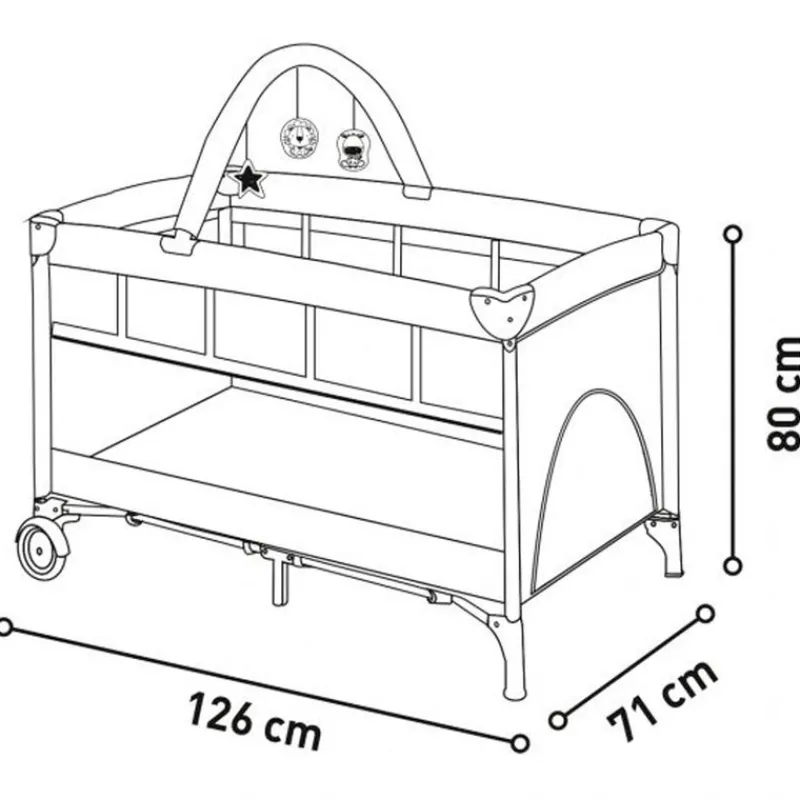 Esta cuna dispone de un colchoncito decorado a conjunto, un arco de juegos del que cuelgan simpáticos peluches y en uno de los laterales tiene una práctica gatera para facilitar el acceso del niño de forma autónoma una vez empiece a gatear.