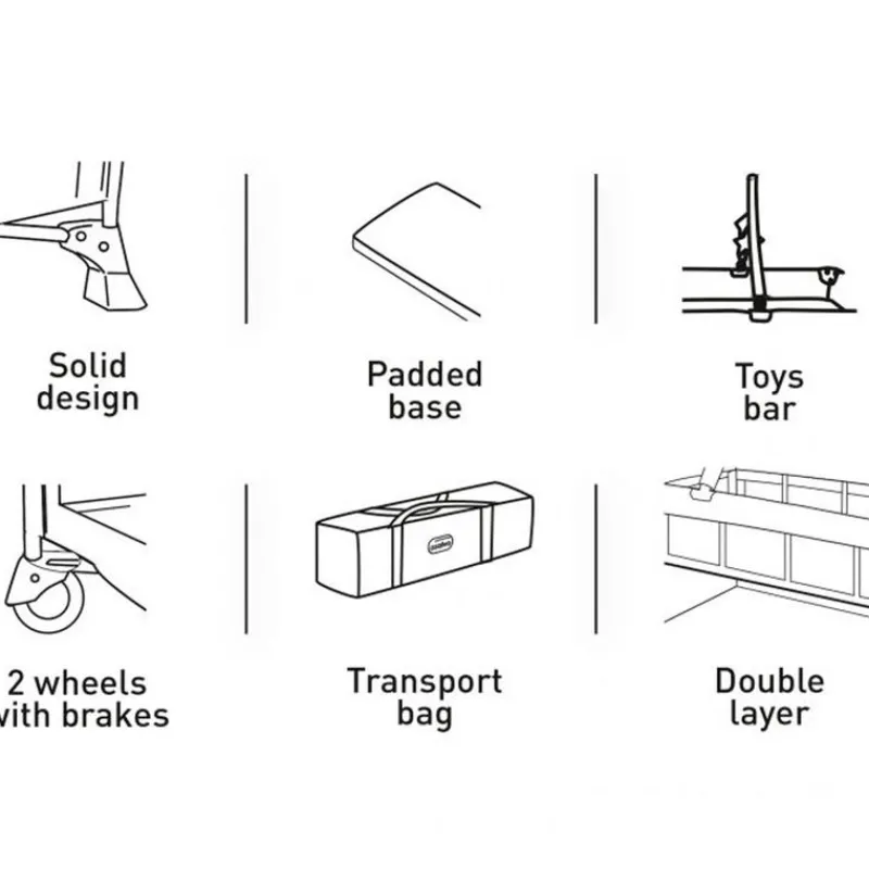 Sus laterales son de rejilla para una correcta ventilación y facilitar el contacto visual con el bebé. Plegado fácil y compacto y ruedas para facilitar el traslado.