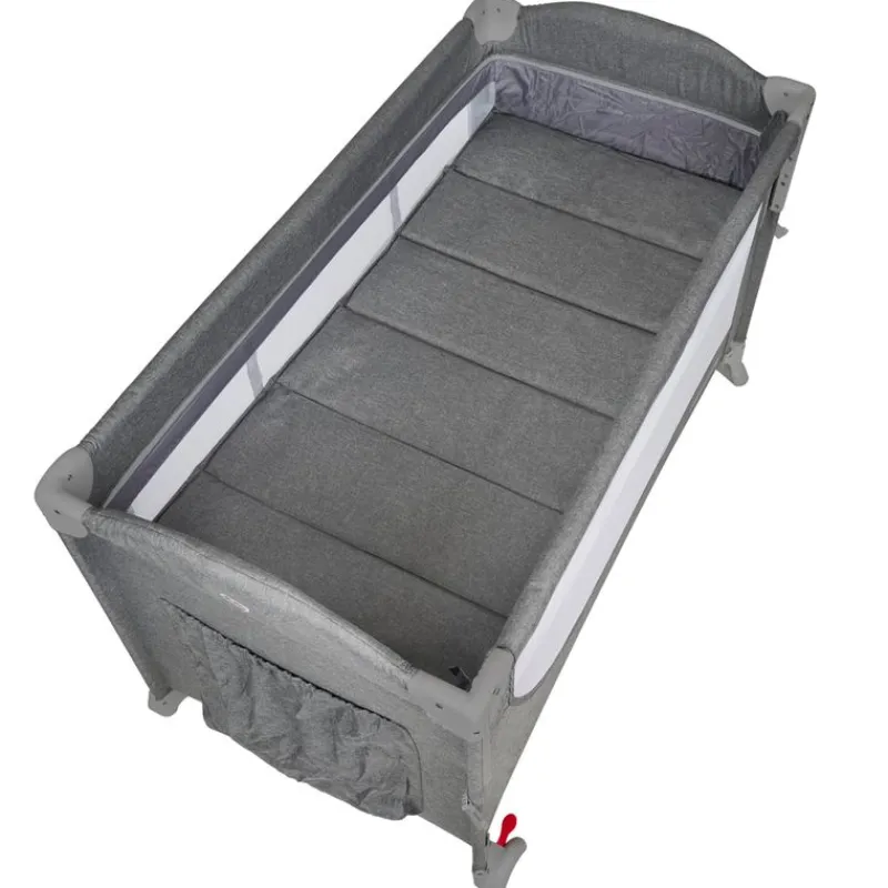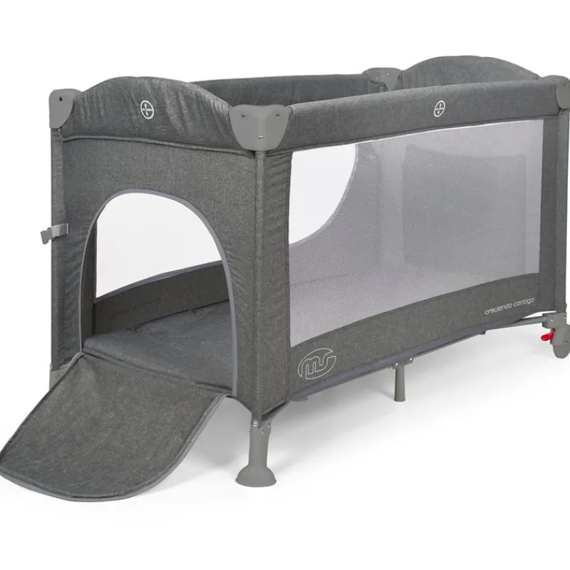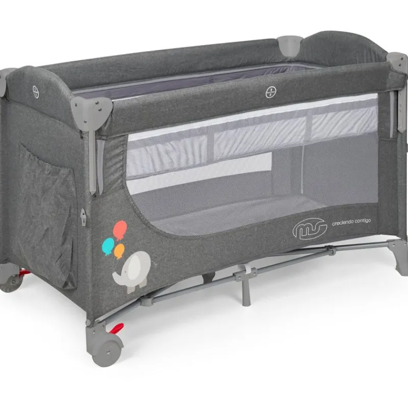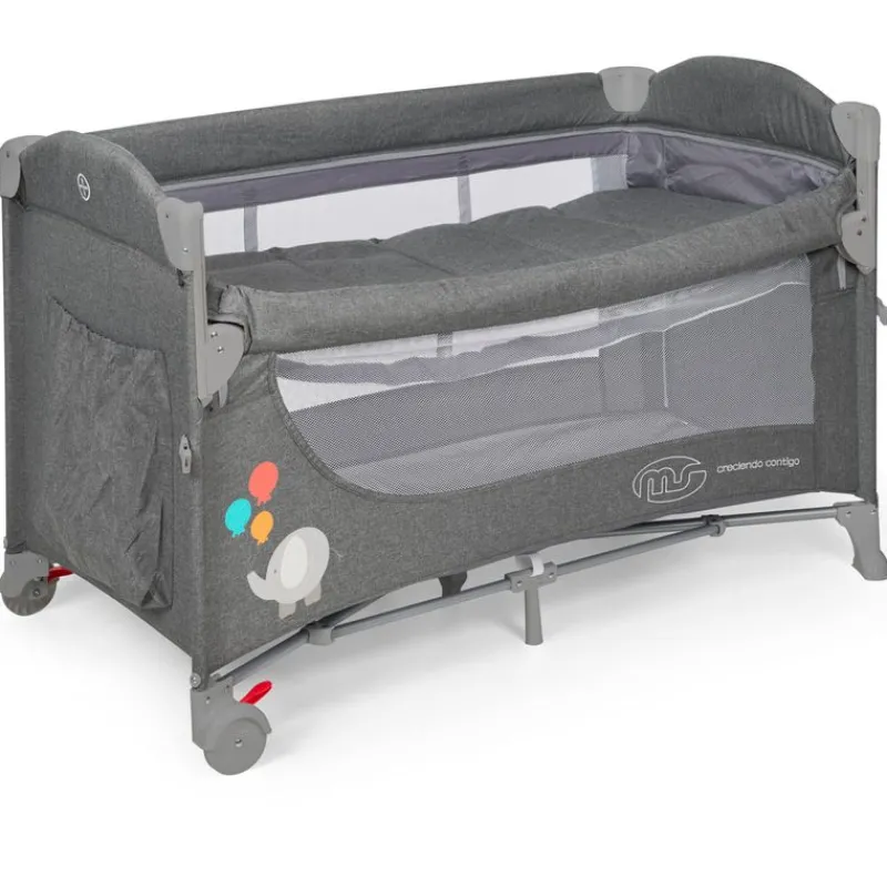Cuna de viaje con doble altura y cambiador que dispone de la posibilidad de ser colecho, pudiendo bajar uno de los dos laterales con un novedoso sistema para poder ponerla pegada a la cama de los papás para tener al bebé cerca a la hora de dormir, de las tomas nocturnas, etc…