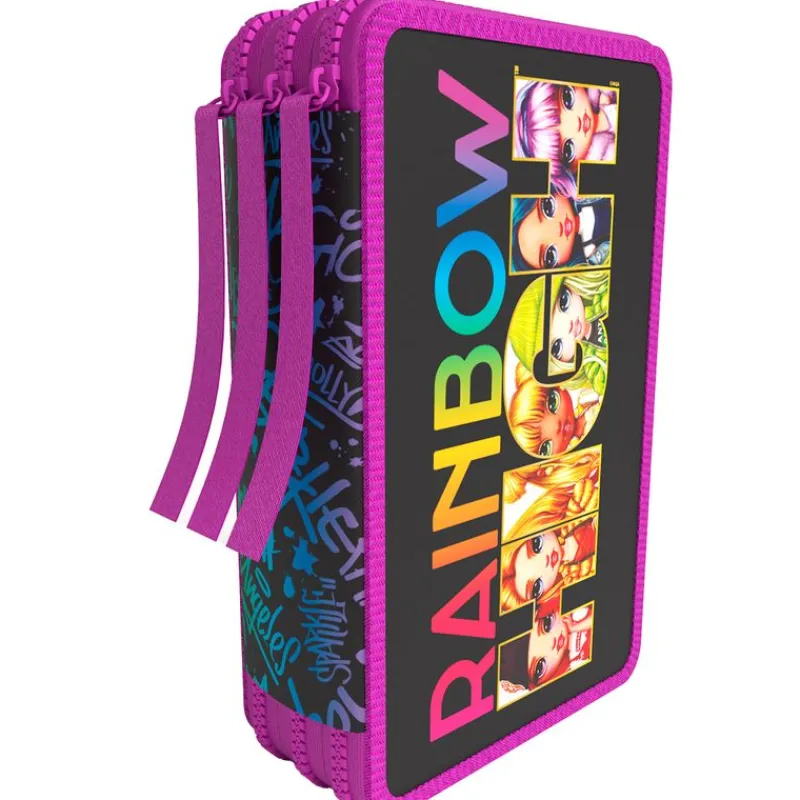 Plumier triple con diseños inspirados en Rainbow High. En su interior encontrarás 16 lápices, 16 rotuladores, 2 bolígrafos, un lápiz, una goma, un sacapuntas y una regla. Sus dimensiones son de 16 cm x 7 cm x 20 cm aproximadamente.