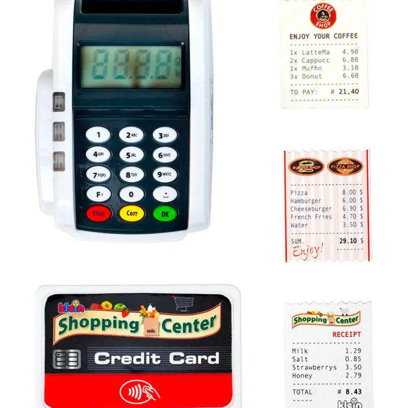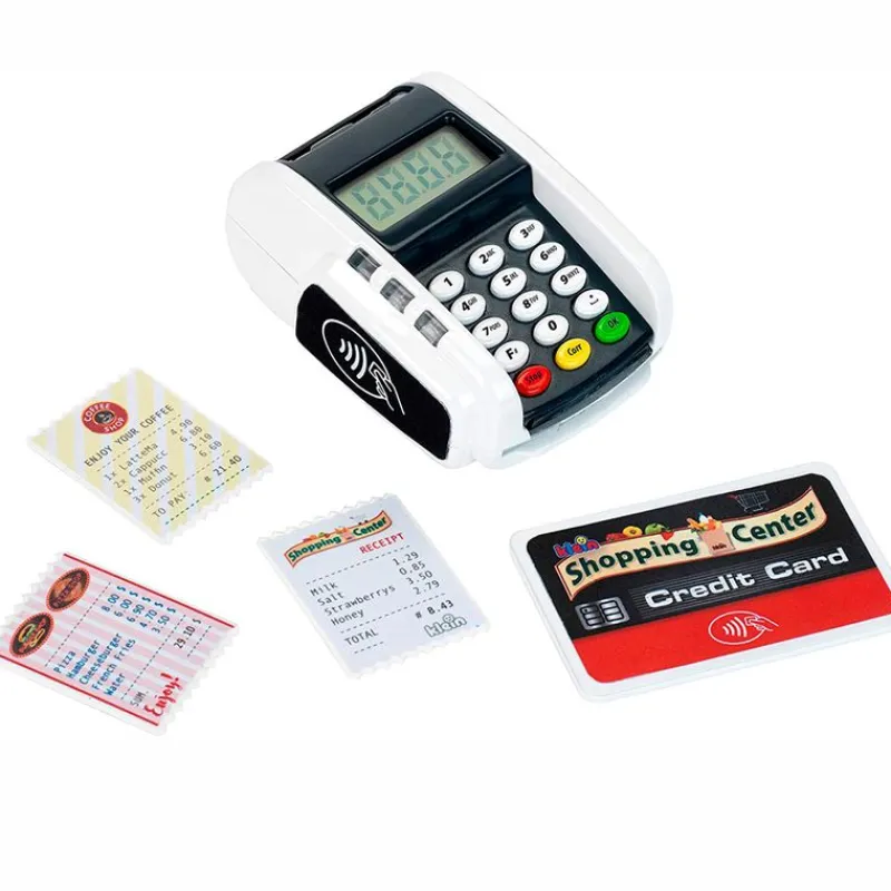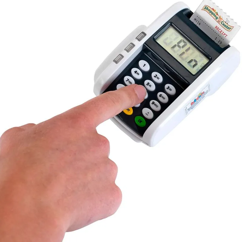 Datafono – terminal de pago ideal para que puedas completar tu supermercado infantil de la manera más moderna. Dispone de función de luz y sonido. Dispone de función de pago sin contacto “Contactless” y una ranura para tarjetas de crédito con sonido. Viene acompañado de 3 tickets de recibo y una tarjeta de crédito con función de pago sin contacto. Funciona con 2 pilas AAA NO incluidas. Recomendado a partir de 3 años.