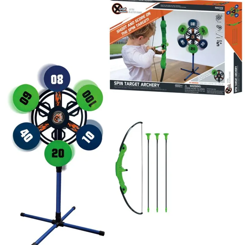 Pon en práctica tu puntería con esta diana giratoria y el arco con flechas.