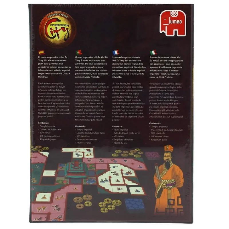 En este juego te convertirás en uno de los consejeros del emperador Wei Zy Yang. El emperador es demasiado joven para gobernar, por lo que tendrás el objetivo de luchar para poder aumentar tu influencia sobre la Ciudad Prohibida. Deberás intentar cerrar las habitaciones en las que tengas mayor influencia para hacerte con todo el control. Ganará la partida el consejero que consiga más poder. En el interior encontrarás un tablero, una págoda 3D, tokens de valor y 4 tipos de loseta dependiendo del equipo. Recomendado a partir de 8 años.