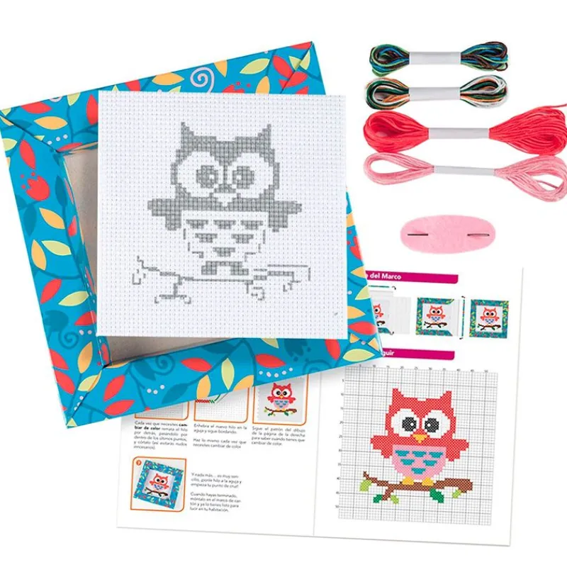 ¿Quieres aprender a hacer punto de cruz? Este juego te enseñará como hacerlo de una manera sencilla y paso a paso ¡Podrás crear un simpático búho! Solo deberás seguir las crucecitas de la rejilla impresa con el dibujo. Después podrás colocarlo en un bonito marco, que viene incluido. En el interior encontrarás accesorios como hilo de bordar de diferentes colores, aguja de coser, tela de bordar, instrucciones y el marco de cartón. Es beneficioso para el desarrollo de la destreza manual. Recomendado a partir de 6 años.