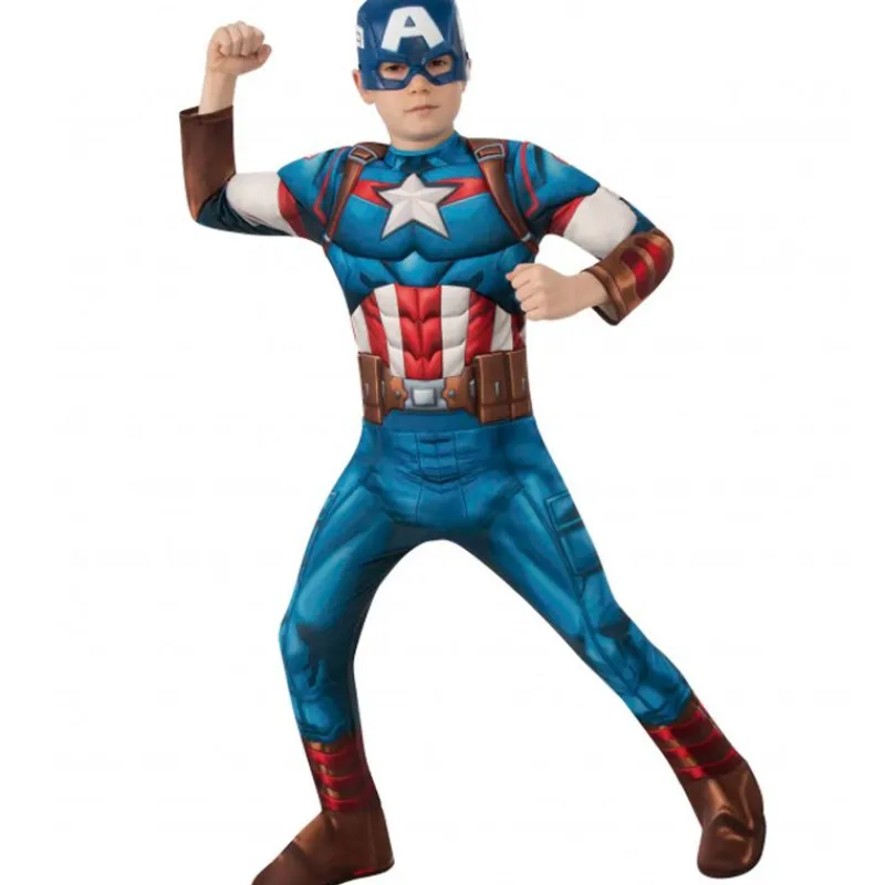 Disfraz inspirado en tu superhéroe favorito, Capitán América. Se compone de un jumpsuit (mono) con cubrebotas y acompañado de la máscara.