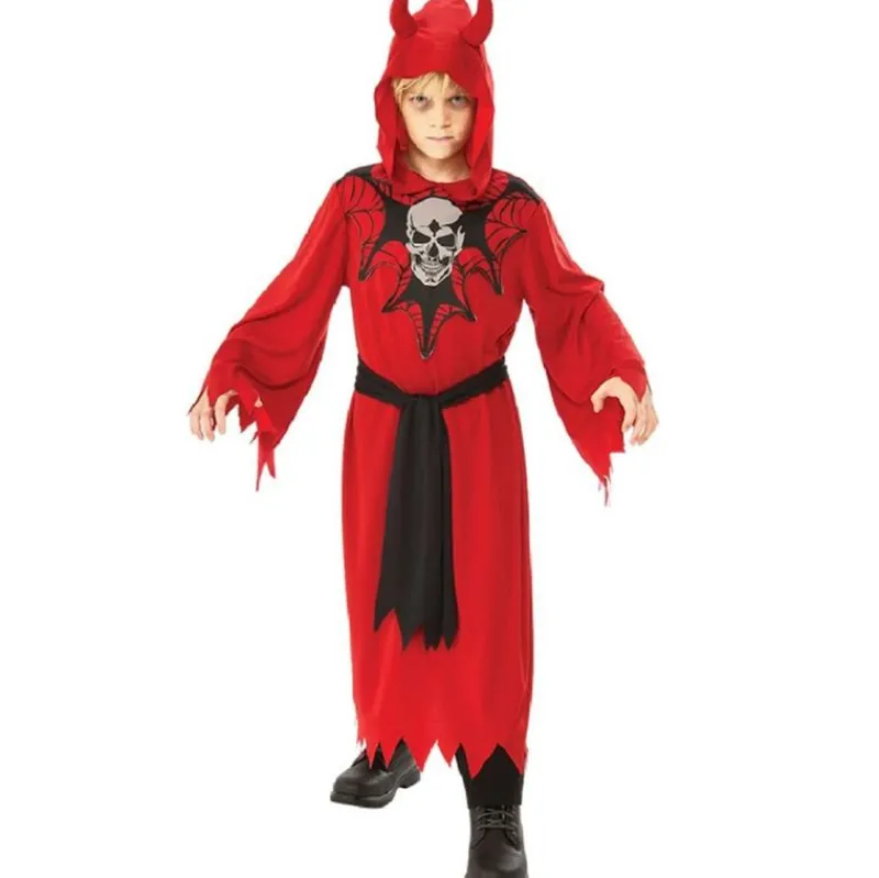 Disfraz de diablo justiciero infantil compuesto de una túnica con capucha con cuernos y cinturón. No contiene accesorios.