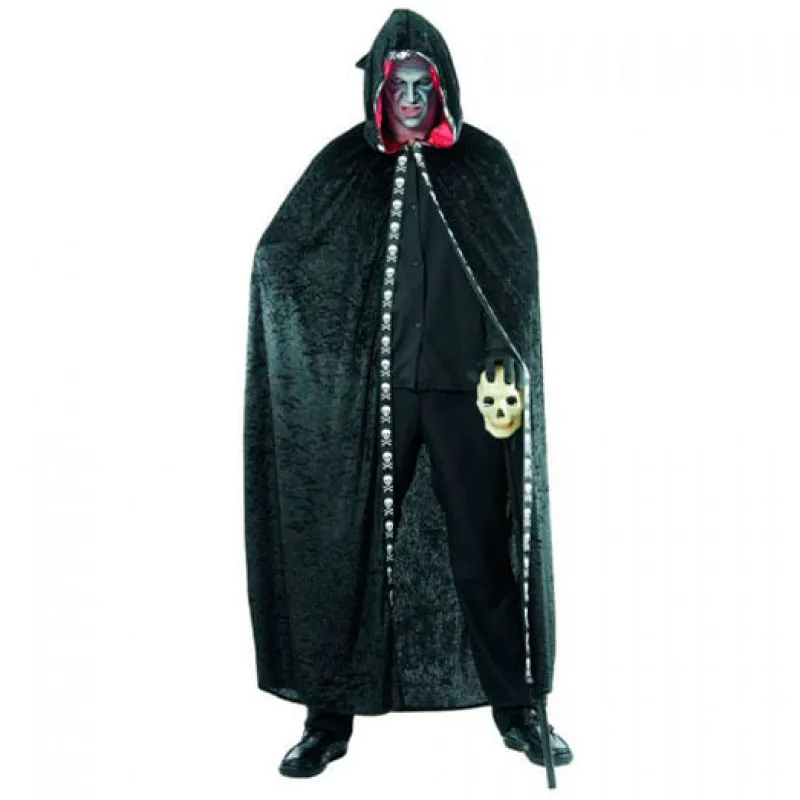 Disfraz de encapuchado oscuro para adulto en color negro con ribete de calaveras. NO incluye pantalones, camiseta, zapatos y calavera.