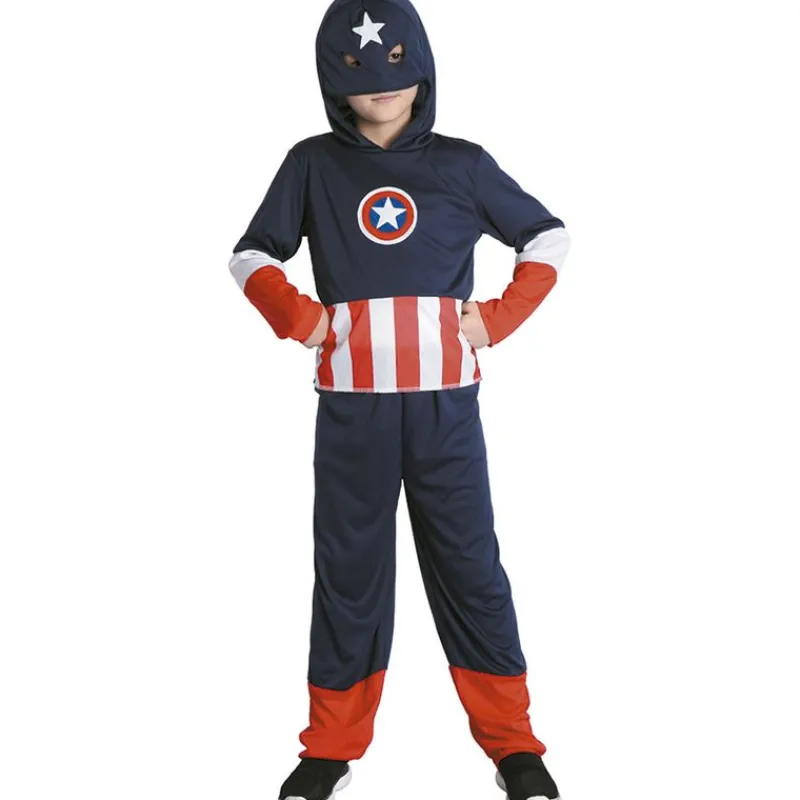 Disfraz de superhéroe infantil compuesto de una camiseta con capucha y unos pantalones.