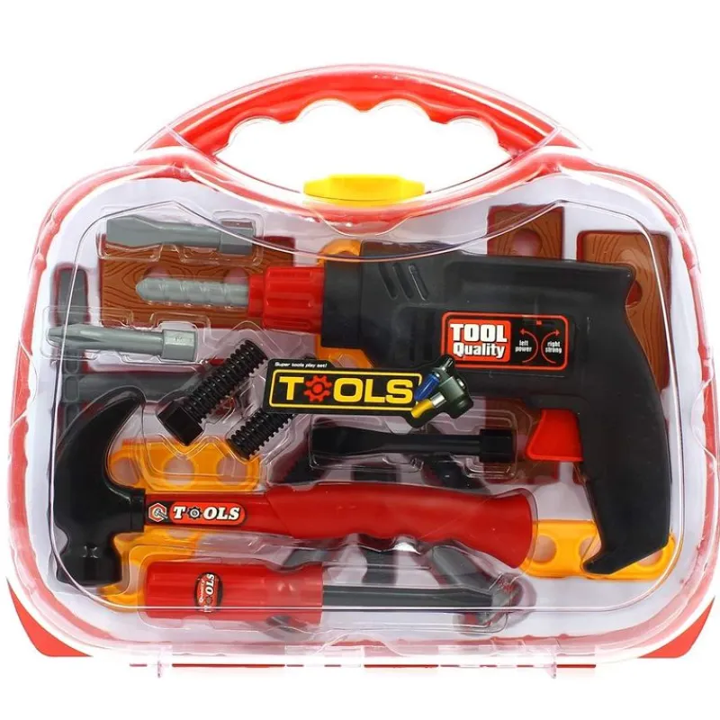 Increible maletín con herramientas infantiles (plástico) para bricolaje. En su interior tiene un taladro con su broca, un martillo, y muchos accesorios para que el niñ@ pueda imitar y desarrollar su imaginación.
