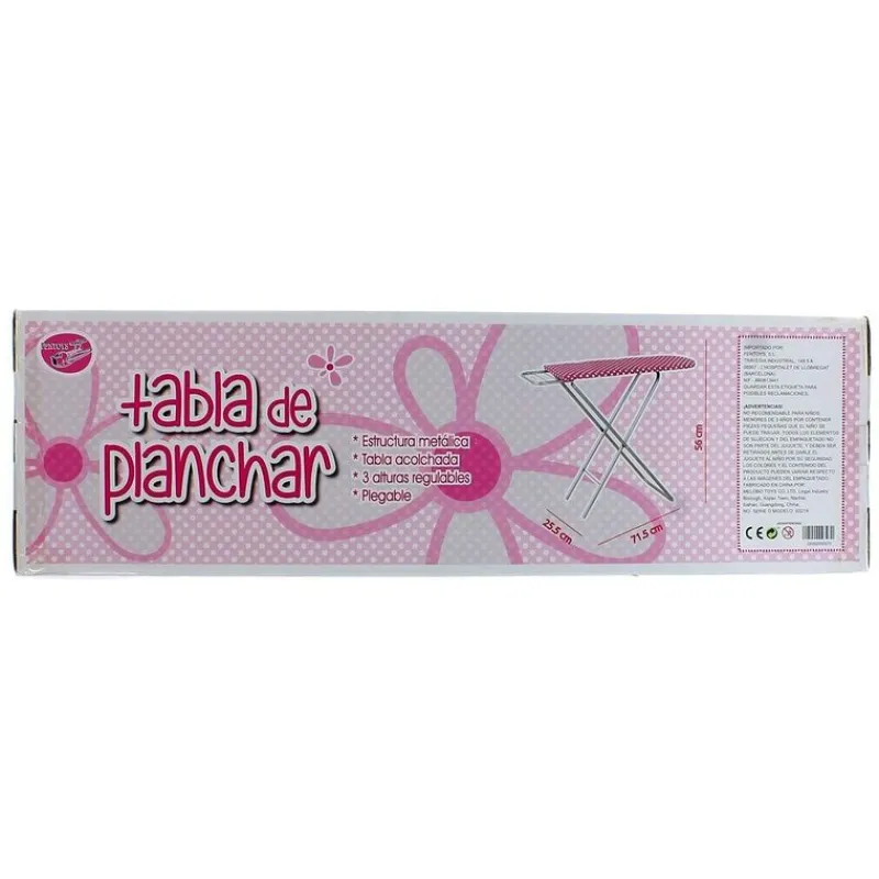 Tabla de planchar infantil de color rosa siendo sus medidas las siguientes: 56 cm de alto, 71,5 cm de largo y 25,5 de ancho.
