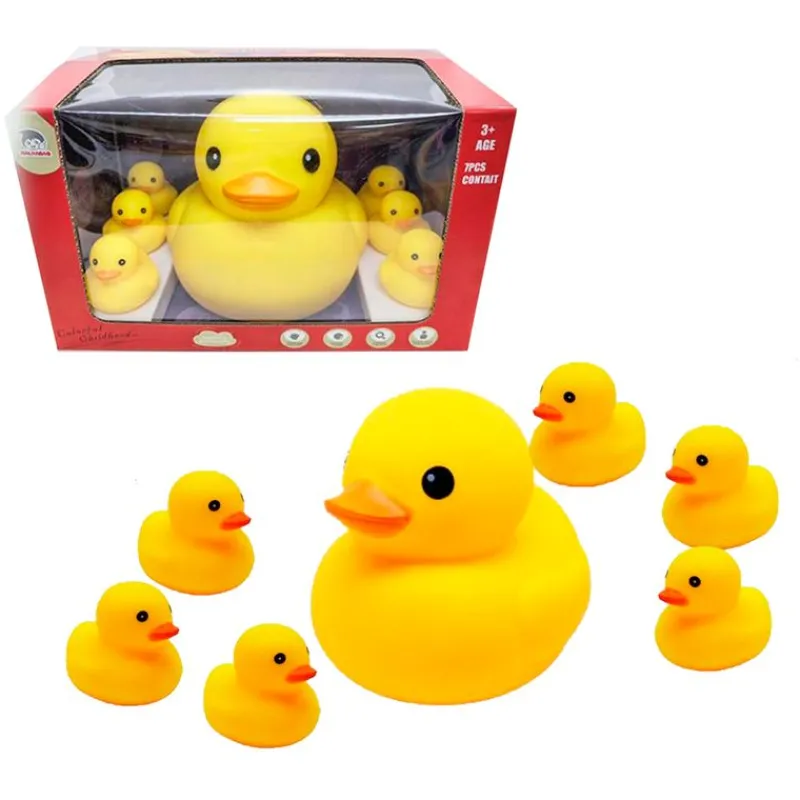 Divertido set de 7 patitos de goma compuesto por 1 patito grande (la mamá pato) y 6 patitos pequeños.