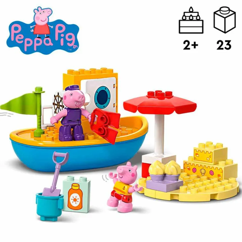 Pack de la colección Lego Duplo, compuesto de 23 piezas, con las que podrás construir una excursión inspirada en la serie de animación Peppa Pig. Date un paseo con Abuelo Pig, agarra el timón y dirige el barco hacia la playa, abre la puerta de la cabina y descarga el barco del abuelo Pig, los artículos de playa de Peppa ¡Aprende a protegerte del sol! Peppa se pone crema bajo la sombrilla ¡Ayuda a Peppa a ponerse las aletas! Peppa construye castillos de arena y recoge conchas. Recomendado a partir de 2 años.