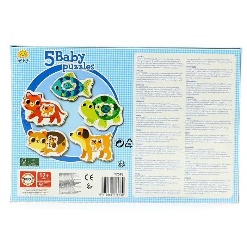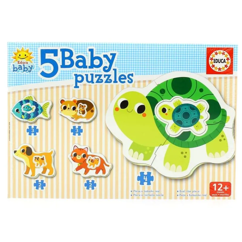 Ayuda a tu pequeñ@ a montar estos 5 adorables puzzles de animalitos domésticos como un pez, un perrito, una tortuga, un gatito o un hámster. Son progresivos de 2 a 4 piezas a tamaño real, para que puedan jugar con ellas. Al ser piezas más grandes son más fáciles de manipular. Servirán para estimular la curiosidad, psicomotricidad e imaginación de tu pequeñ@. Recomendado a partir de 12 meses.