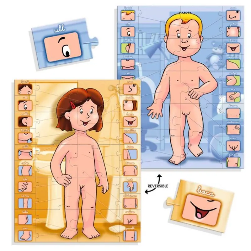 Puzzle reversible de 30 piezas para aprender las partes del cuerpo. En un lado encontrarás el cuerpo de una niña y en el reverso el cuerpo de un niño. El juego consiste en juntar la imagen central con el cuerpo humano y colocar el resto de fichas de las partes del cuerpo. Recomendado a partir de 5 años.