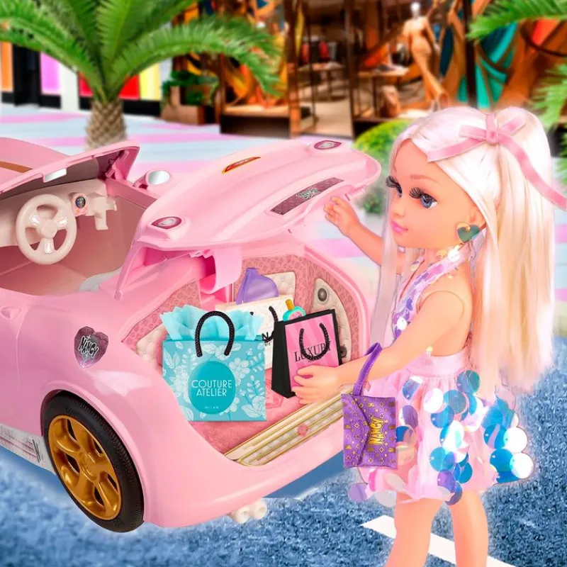 El vehículo incluye varios accesorios de compras como gafas de sol, perfume, lazo y una tarjeta de crédito para jugar a ser una auténtica fashionista.