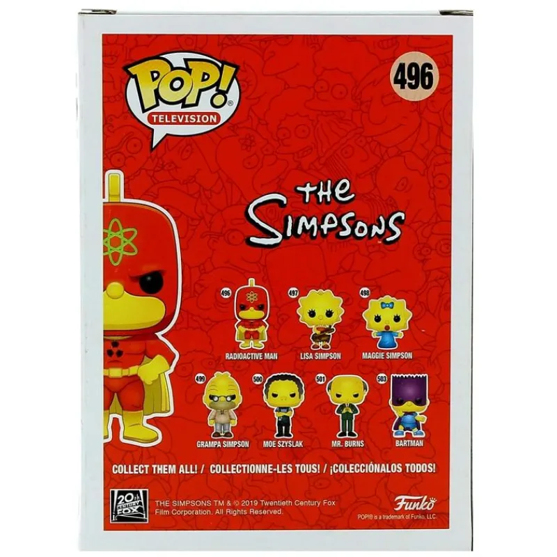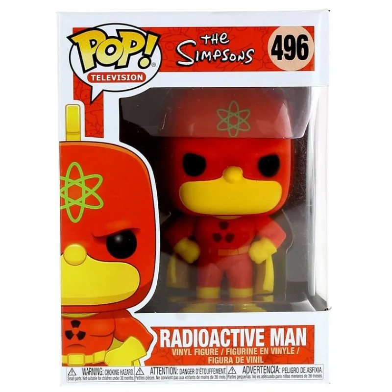 Figura fabricada en vinilo de la colección Funko POP con número 496, inspirada en el personaje de Radioactivo Man, uno de los personajes principales de la mítica serie de animación ‘Los Simpson’.